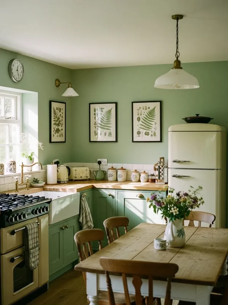 This warm and welcoming kitchen blends soft sage cabinetry with creamy vintage appliances to create the sweetest countryside mood. The muted green walls set a calming backdrop while botanical prints add a touch of nature that feels thoughtful and collected. A classic farmhouse sink, golden hardware, and warm wooden countertops make the whole room feel gentle and lived in. The cozy little breakfast table with mismatched wooden chairs finishes the space with that perfect everyday comfort. Sunlight pours in through the window and highlights all the charming details from the ceramic canisters to the vase of fresh garden flowers.