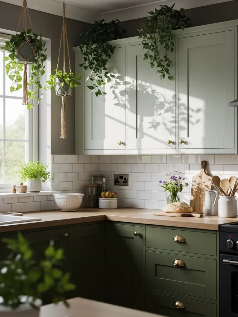 This kitchen pairs soft sage upper cabinets with deeper green lowers for a look that feels calm and grounded. The warm wood countertops add a natural warmth, while the classic white subway tile keeps everything bright and clean. The hanging plants and trailing greenery above the cabinets bring so much life into the space and make the sunlight feel even softer as it filters across the room. Little touches like brass hardware, simple pottery, and a fresh loaf of bread on the counter give the whole corner a charming farmhouse feel that feels lived in rather than styled.