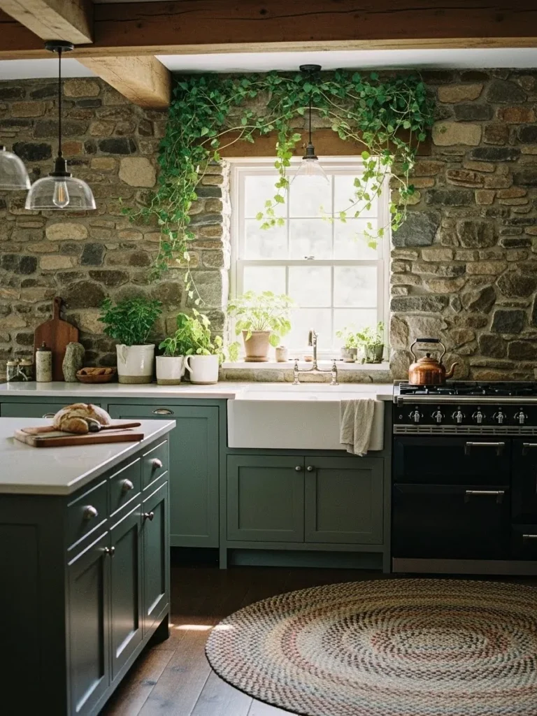 This charming kitchen blends rustic stone walls with soft green cabinetry that instantly warms up the entire space. The farmhouse sink sits right under a sunlit window, surrounded by potted herbs that make the whole place feel alive and wonderfully earthy. A trailing ivy frames the window like natural drapery, adding that effortless, lived-in charm every farmhouse lover secretly dreams about. The dark range creates a beautiful contrast against the lighter tones, while the braided rug and wooden beams bring in the kind of texture that makes the room feel grounded and welcoming.