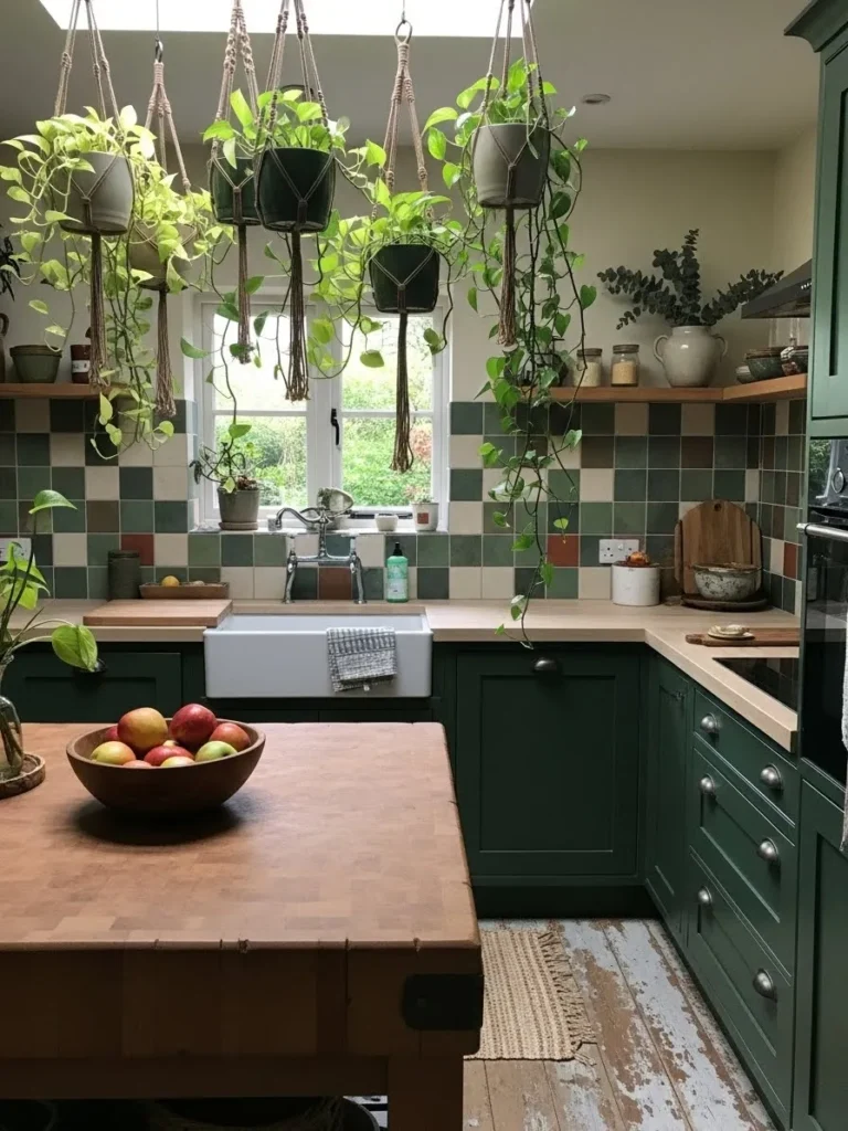 This kitchen feels like the sweetest little indoor conservatory with its deep green cabinetry, soft checkered backsplash, and the most charming display of hanging plants right over the sink. The macrame planters instantly give the room that earthy farmhouse personality, while the skylight above floods the space with gentle natural light that makes everything glow. The rustic butcher block table at the center adds warmth and a sense of history, and the farmhouse sink ties everything together with that classic country charm. Every corner feels thoughtful from the jars on the wood shelves to the well loved cutting boards and leafy vines trailing playfully across the countertops.