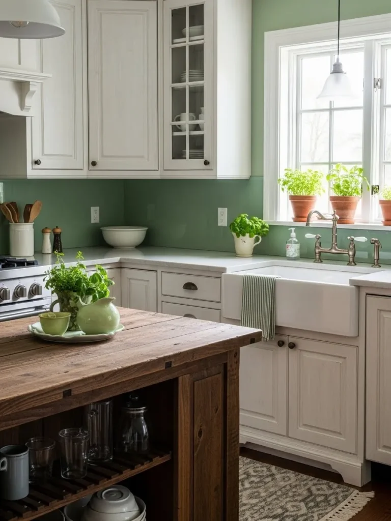 This kitchen blends soft sage green walls with creamy white cabinetry to create the sweetest, sunniest farmhouse moment. The glass-front cupboard adds a touch of elegance, while the apron-front sink and brushed-nickel faucet keep everything feeling timeless and homey. I love how the warm wood island anchors the room with a rustic touch, and those little terracotta herb pots on the windowsill bring just the right amount of life into the space. The whole room feels bright and welcoming thanks to the natural light pouring in, making it a perfect example of how green can feel both calming and fresh at the same time.