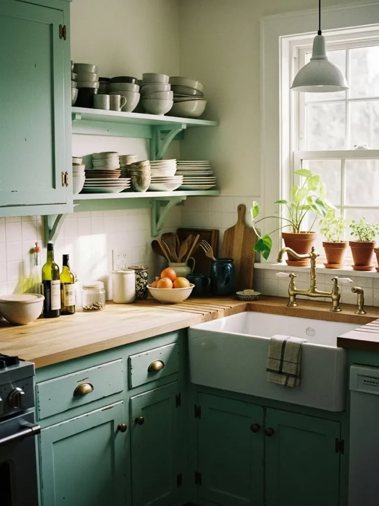 This kitchen brings together the sweetest blend of soft mint cabinetry, warm butcher block countertops, and a charming farmhouse apron sink that instantly makes the whole space feel welcoming. The open shelving adds a relaxed and airy vibe and shows off those creamy ceramics in the prettiest way. Sunlight pours in through the window and lands on the little row of potted herbs and plants that feel like a tiny indoor garden. The vintage brass faucet adds a subtle touch of old world charm that fits perfectly with the slightly weathered finish on the cabinets.