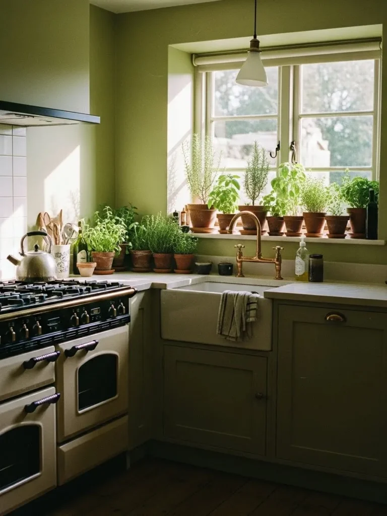 I love how this kitchen gives off that peaceful early morning feeling where you can almost smell the rosemary and basil. The plants make the whole space feel alive, and the gentle green backdrop ties everything together in the prettiest way. It’s the kind of kitchen that makes you want to brew tea, potter around with herbs, and pretend you’re living your own countryside dream.