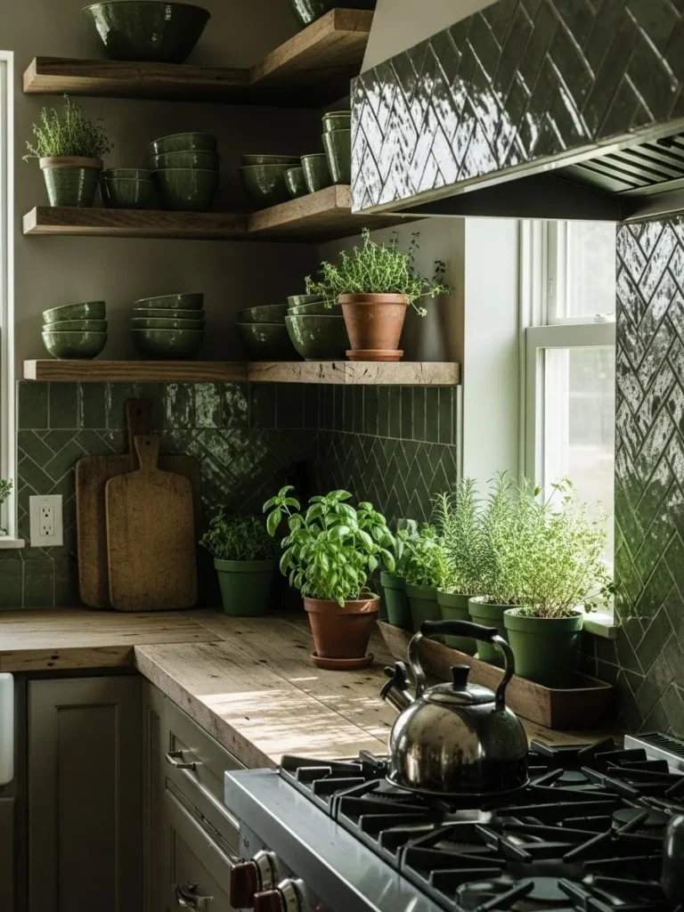 I love how this design feels like a little indoor garden corner. The herbs lined up by the window make me want to start snipping basil leaves for dinner right away and the handmade pottery adds such a personal touch. The green tones feel bold without being loud and the rustic wood keeps everything warm and lived in. It is the kind of kitchen that makes me want to slow down make a cup of tea and enjoy the simple beauty of a space that feels both stylish and nurturing.