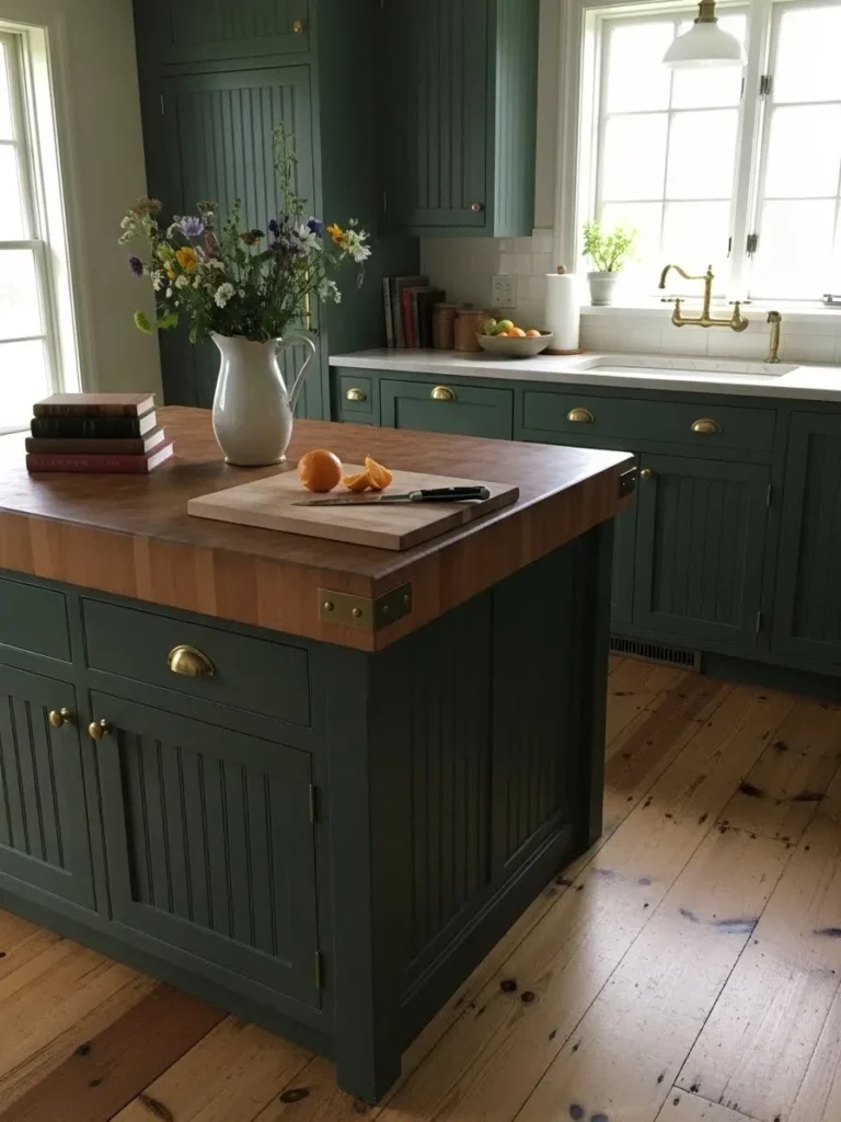 This kitchen brings all the warm country charm with its deep green beadboard cabinets, brushed brass hardware, and that gorgeous butcher block island that feels like it has hosted a thousand family recipes. The soft white countertops brighten the room while the vintage style sink and brass faucet add a lovely old fashioned touch. Sunlight pours in through the big farmhouse windows, catching the wildflower bouquet on the island and making the whole space feel fresh and lived in. Even the naturally worn wood floors add personality, like they’ve been part of the home’s story for years.