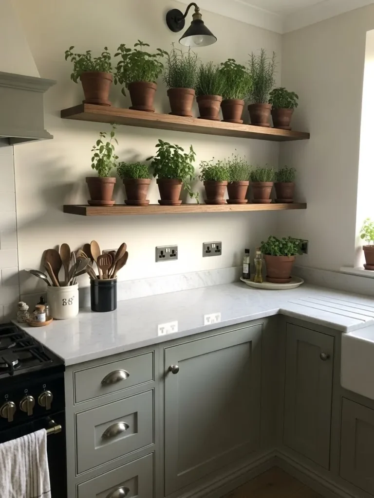This sweet little farmhouse kitchen brings the outdoors in with the most charming display of potted herbs lined up on warm wooden floating shelves. The soft green cabinetry sets such a gentle backdrop and pairs beautifully with the terracotta pots. The marble countertop keeps everything looking clean and airy while the black sconce adds just the tiniest hint of rustic character. It feels like the kind of kitchen where you can whip up dinner with basil you snip right from the wall and then pop fresh rosemary into the oven without even stepping outside.