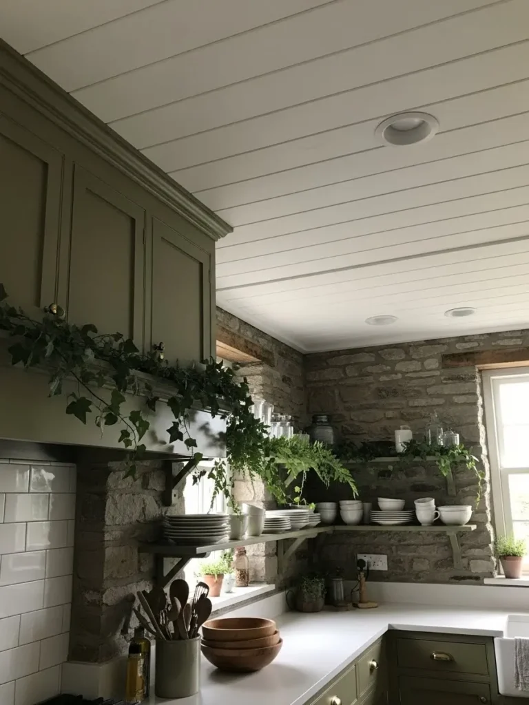 This charming farmhouse kitchen mixes soft sage green cabinetry with rustic stone walls in the most effortless way. The open shelving feels warm and welcoming with stacks of white dishes and glass jars arranged in a casual but curated way. Lush trailing ivy and ferns tuck themselves along the shelves and upper ledges and instantly bring that leafy garden feeling inside. The white shiplap ceiling adds brightness while the deep window frames make the whole space feel like a cozy hideaway that still lets in plenty of natural light.