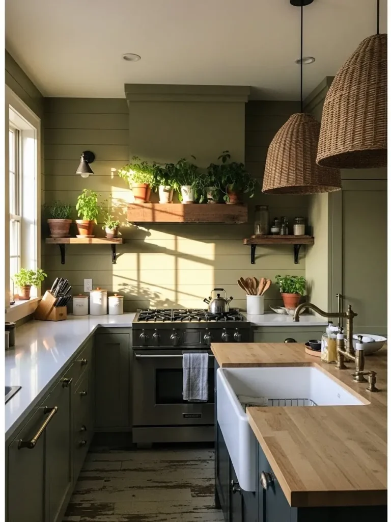 This kitchen brings together the softest sage green walls with plenty of warm natural textures that make the whole space feel peaceful and lived in. The open shelves display rows of potted herbs that catch the sunlight in the prettiest way, and the rustic wood accents keep everything grounded. A farmhouse sink anchors the island alongside a warm butcher block countertop that feels both practical and welcoming. The woven pendant lights add a lovely dose of texture while the classic stainless stove and simple white countertop balance the space with a clean fresh look.