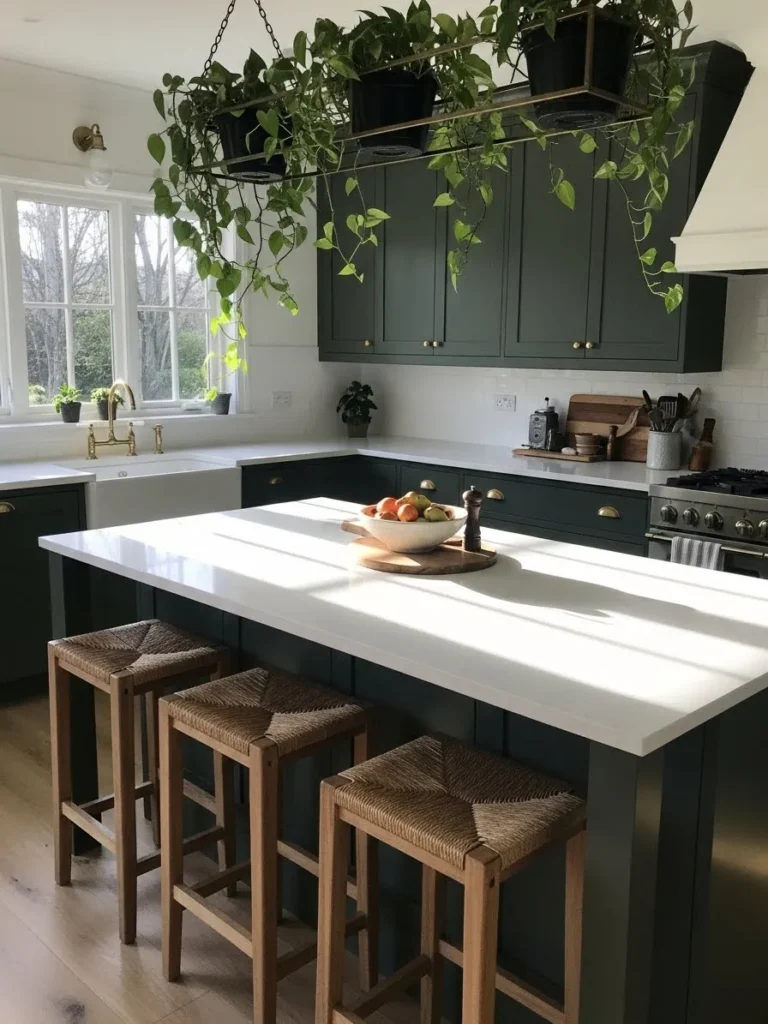 This kitchen pairs deep green cabinetry with bright white countertops for a look that feels fresh and inviting. The long island offers plenty of workspace and is paired with woven stools that add a warm rustic note. What really steals the scene is the overhead plant rack filled with trailing greenery, which softens the structured lines of the space and makes the whole room feel alive. With sunlight pouring through the big farmhouse windows and a few brass accents to warm things up, the space feels both polished and down to earth.