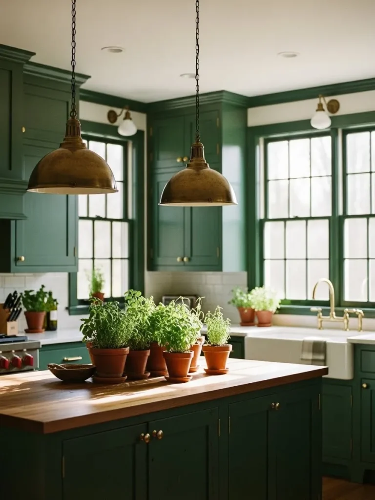 This kitchen brings together deep forest green cabinetry, warm wood accents, and sun soaked windows to create a cozy farmhouse space that feels alive with natural charm. The shaker style cabinets add a classic touch while the oversized brass pendant lights give everything a soft glow. A row of terracotta pots filled with fresh herbs sits proudly on the wooden island, and the apron front sink with its vintage inspired faucet adds such a lovely cottage feel. The big windows pull in streams of natural light that make the whole room feel warm and welcoming.