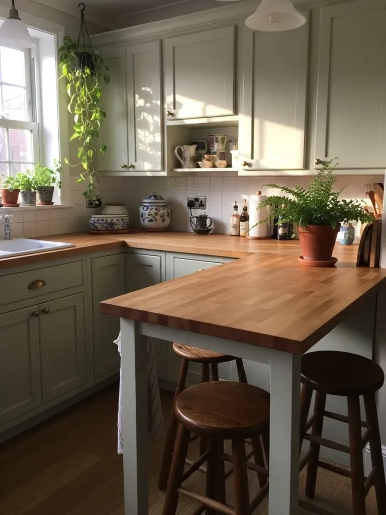 This charming kitchen pairs soft sage cabinetry with warm butcher block countertops that instantly make the space feel calm and cozy. Sunlight pours through the window and highlights the pretty mix of pottery, plants, and vintage inspired jars tucked along the counters. The layout feels wonderfully practical with its corner workspace and petite breakfast bar that fits snugly into the room. The hanging pothos and potted herbs bring a fresh, natural touch that gives the whole kitchen that peaceful greenhouse feel without trying too hard.