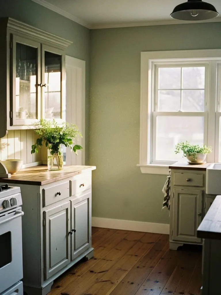 This kitchen brings together the dreamiest mix of soft sage walls, warm natural light, and charmingly worn cabinetry that feels perfectly lived in. The muted green tone sets a soothing backdrop while the classic white trim and vintage inspired cabinets add that timeless farmhouse character we all adore. Sunlight spills gently across the butcher block countertops and the rustic wood floors, making the space feel cozy and bright at the same time. The simple pops of greenery on the counters pull the whole look together and make the room feel fresh and inviting.