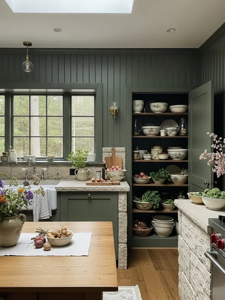Deep Green Pantry Kitchen With Rustic Cottage Charm