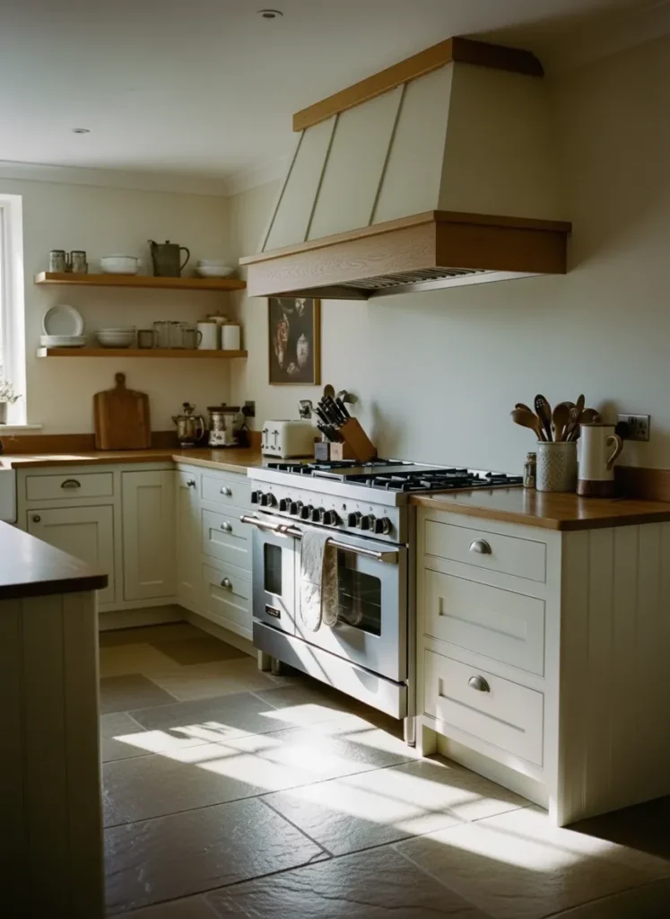 This kitchen feels like the kind of space where slow mornings happen without even trying. The creamy white cabinets create a calm and timeless backdrop while the natural wood accents add a gentle warmth that feels instantly welcoming. I love how the oversized range hood becomes a statement without trying too hard since its simple lines and wood trim keep everything soft and understated. The open shelves give the room a relaxed farmhouse touch and the stone floor catches the light in a way that makes the whole space glow. It is the kind of layout that feels practical and beautiful at the same time which is exactly what a cozy luxury farmhouse kitchen should be.