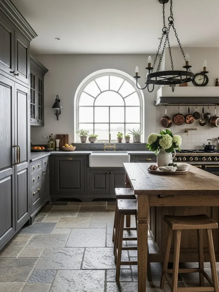 This kitchen blends timeless farmhouse character with a refined, luxurious feel. The deep gray cabinetry adds a grounded presence that instantly makes the room feel sophisticated, while the arched window floods the space with soft natural light that brightens every corner. A classic farmhouse sink sits front and center, framed by brass accents that bring just the right touch of polish. The stone flooring feels wonderfully earthy and pairs beautifully with the chunky wooden island that looks ready for morning coffee chats or late night baking sessions. Even the black iron chandelier and the row of copper pots give the space a collected charm that feels both authentic and elevated.