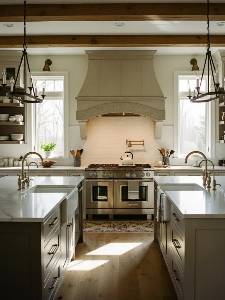 I love how this design blends pure practicality with a cozy, lived in warmth. The symmetry makes everything feel calm and intentional and the soft textures keep it from feeling too formal. I can easily imagine chatting with a friend across one of the islands while a pot simmers on the stove. It is the kind of kitchen that feels beautiful without trying too hard and that is always my favorite kind of luxury.
