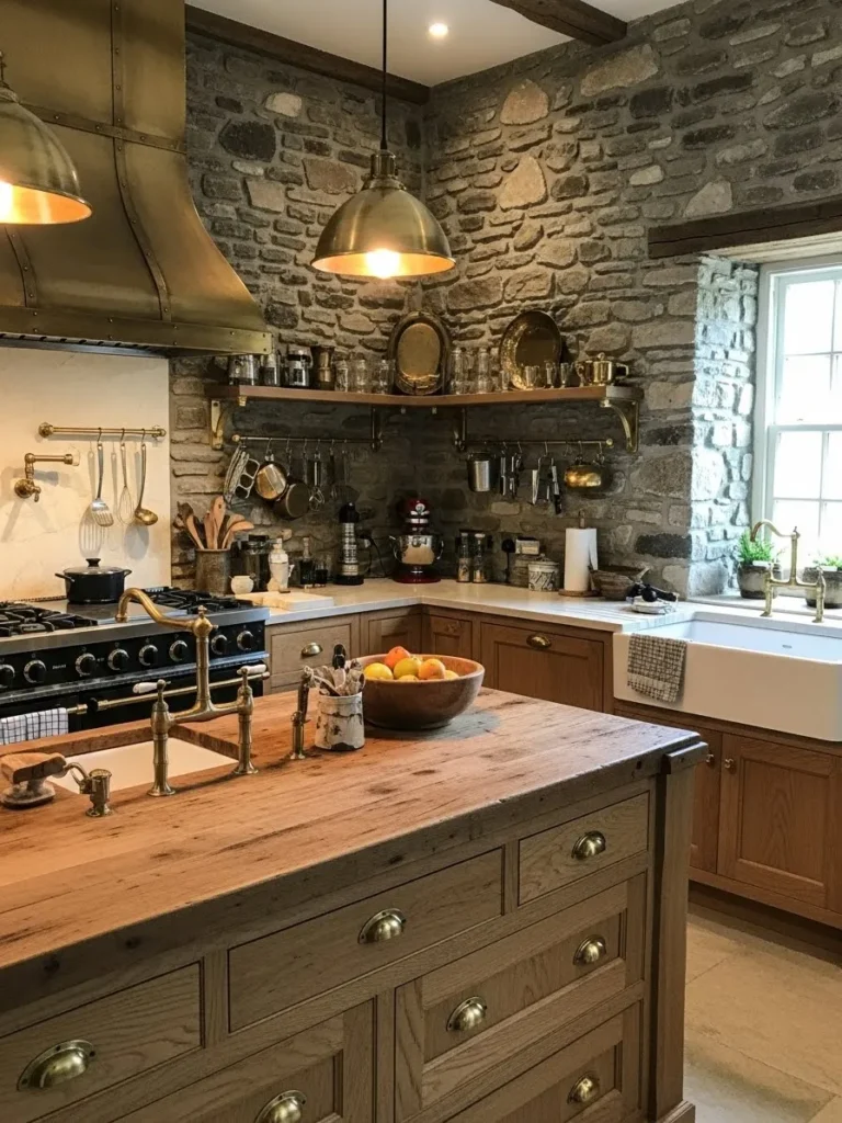 This kitchen brings all the charm of an old stone cottage but with the luxurious touches that make it feel wonderfully elevated. The textured stone walls create such a gorgeous backdrop for the warm wood cabinetry and that stunning butcher block island. I love how the brass accents add a soft glow, from the pendant lights to the range hood and even the cabinet hardware. The open shelves lined with copper and glass pieces make the whole space feel collected and inviting. Everything works together to create a kitchen that feels both historic and beautifully refined.