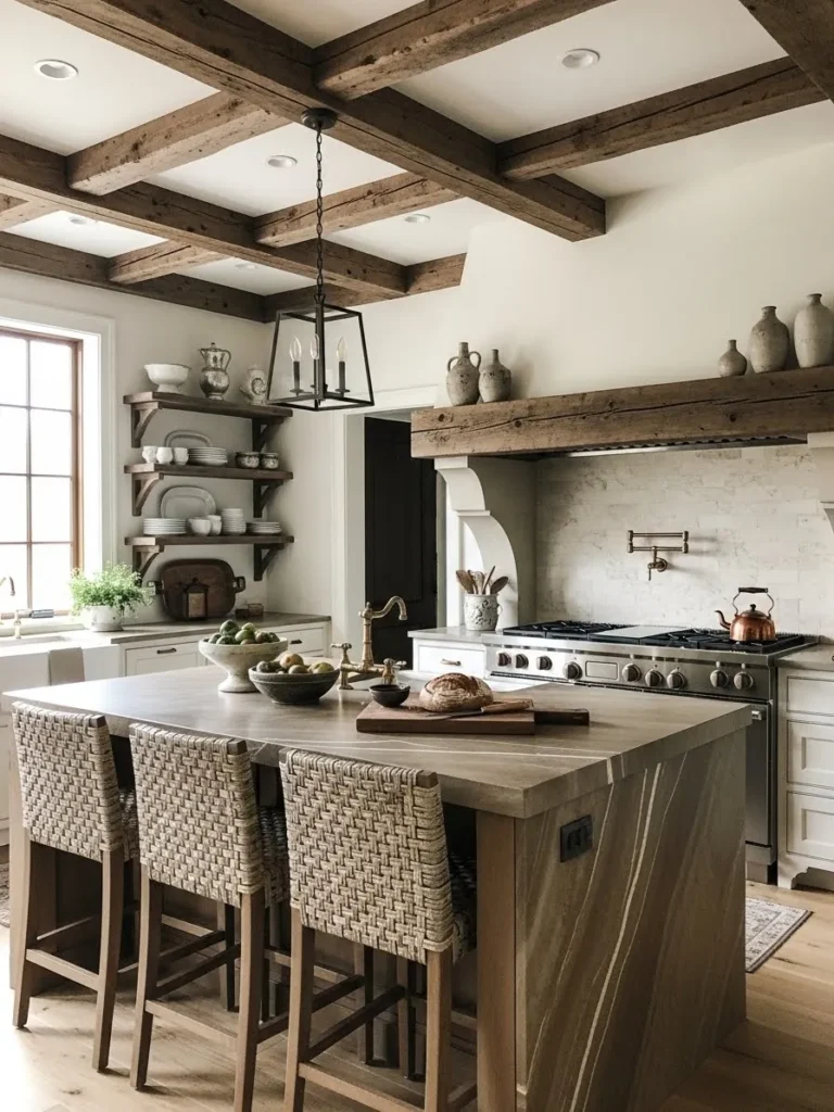 This kitchen blends rustic soul with a polished modern farmhouse feel in the prettiest way. The exposed wooden ceiling beams instantly pull the room together and make the whole space feel grounded and inviting. The island features a gorgeous stone top with gentle veining that adds a soft touch of luxury. I love how the woven bar stools bring in that natural texture that always makes a space feel cozier. The open shelving filled with simple white dishes and a few collected pieces keeps everything airy while still feeling curated. Even the stove nook has its own moment with a chunky wood beam and a row of pottery that adds just enough character.