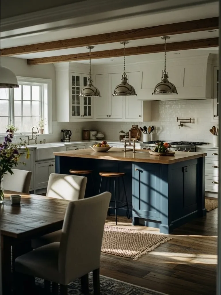 This kitchen blends classic farmhouse comfort with a touch of modern confidence. The crisp white cabinetry keeps the space feeling bright while the navy island adds a gorgeous pop of color that instantly becomes the star of the room. Warm wood beams draw the eye upward and balance the cooler tones with a soft rustic feel. The polished pendant lights create a hint of vintage sparkle above the island and the butcher block counter brings in that cozy texture everyone loves in a farmhouse kitchen. With sunlight streaming across the wide plank floors and simple accessories styled just right, the whole room feels thoughtful and beautifully lived in.