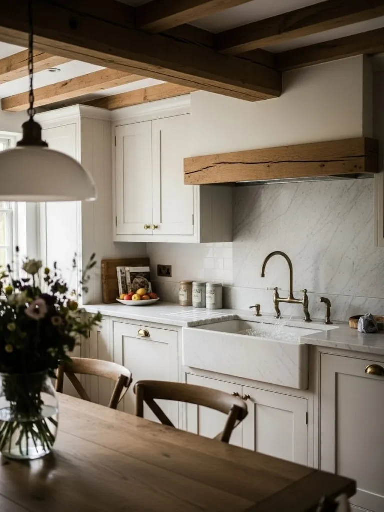 This kitchen blends classic farmhouse charm with a whisper of luxury. The creamy cabinetry feels calm and inviting, especially paired with the marble style backsplash and that beautifully chunky apron front sink. The brass hardware adds a gentle glow that makes everything look a little richer without trying too hard. My favorite detail is the natural wood scattered throughout from the exposed ceiling beams to the rustic range hood trim to the farmhouse style table that ties the whole space together. The room feels bright and peaceful thanks to the soft lighting and the simple styling that keeps everything looking clean but still very lived in.