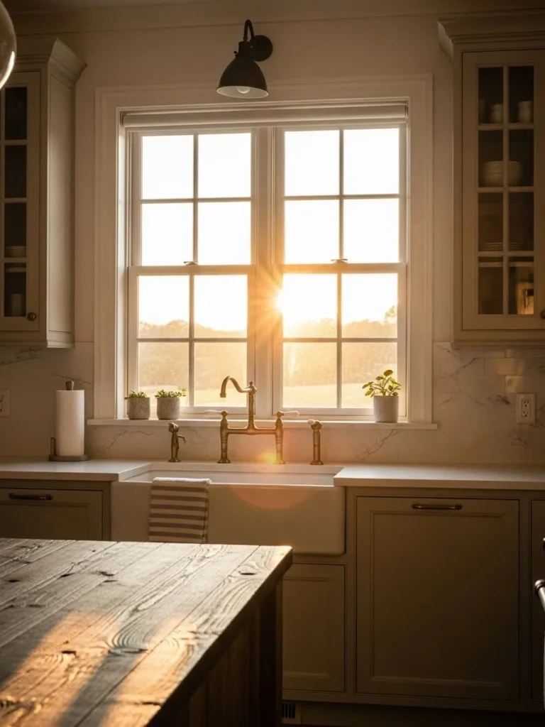 This charming farmhouse kitchen captures that dreamy moment when the morning sun slips through the window and kisses every surface with a warm golden glow. The classic farmhouse sink sits perfectly centered beneath crisp white window panes, framed by creamy cabinetry that feels soft and timeless. Brass fixtures add a gentle touch of vintage charm, and the marble style counters keep everything looking polished without feeling too formal. I love how the natural wood island brings an earthy balance to the light streaming in, creating the coziest gathering spot for slow mornings and peaceful evenings alike.