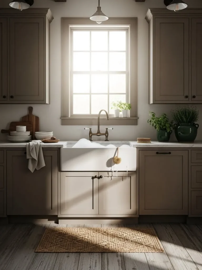 This kitchen feels like a quiet little moment of luxury with its warm beige cabinetry, oversized farmhouse sink and sunlight streaming through the window in the prettiest way. The simple shaker cabinets keep everything looking calm and grounded while the marble style countertop adds a soft touch of elegance. I love how the herbs on the sill and the natural woven rug pull in that cozy lived in charm without taking away from the clean layout. The brushed brass faucet and little wooden accents make the whole space feel warm and intentionally curated.
