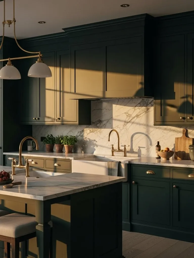 This kitchen blends rich deep green cabinetry with soft marble surfaces and warm brass accents that feel instantly luxurious. The sunlight pours across the cabinets in a way that makes the entire space glow. The marble backsplash adds a graceful touch that balances the bold color of the cabinets while the farmhouse sink and classic hardware bring a cozy lived-in feel. The island offers plenty of prep space and the pendant lights above it add a gentle elegance that completes the look without feeling overdone.