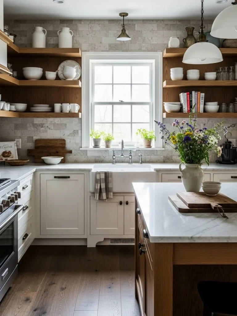 This kitchen blends relaxed farmhouse living with a luxe, polished feel. The white cabinetry and apron sink keep everything bright while the warm oak open shelves bring in that inviting touch everyone loves. Stacked dishes and simple décor create a lived in look that still feels curated. The soft stone backsplash adds texture without overwhelming the space and the island with its marble top gives the room a lovely sense of balance. Natural light pours in through the window and highlights the fresh herbs on the sill which makes the whole space feel cheerful and welcoming.