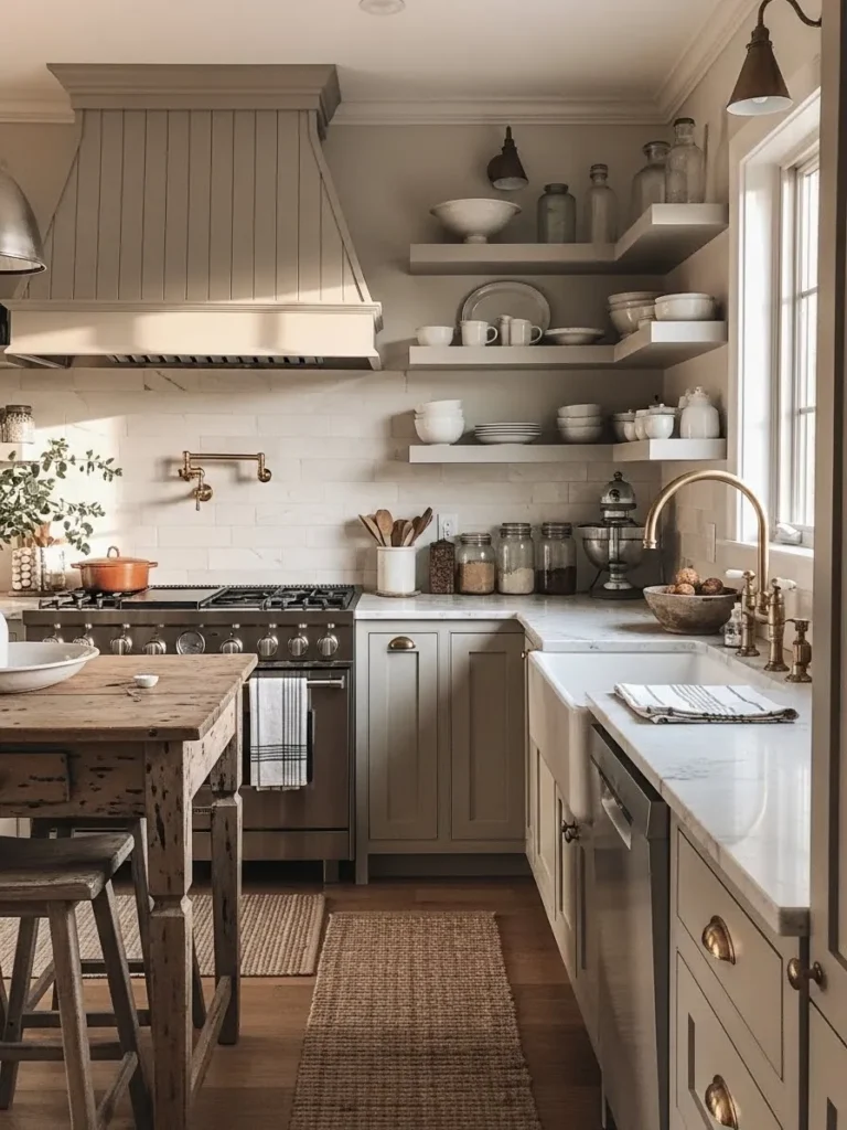 This kitchen blends cozy farmhouse character with a soft minimalist touch that feels wonderfully elevated. The muted cabinetry creates a calm and collected backdrop while the marble style countertops add a hint of quiet luxury. The open shelving keeps everything light and airy which lets the pretty everyday pieces double as decor. A chunky wood island brings in that irresistible rustic texture and the brass fixtures give the entire space a gentle glow. The farmhouse sink, shaker cabinets, and warm lighting all work together to make the room feel welcoming yet refined.