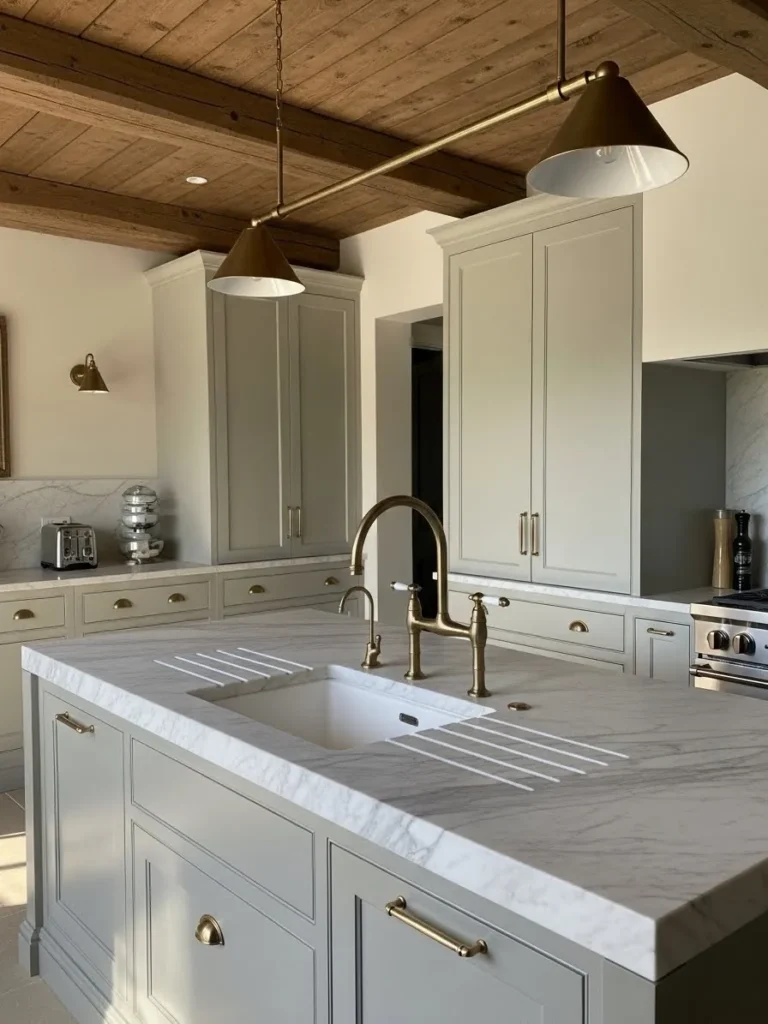 This kitchen blends old world farmhouse warmth with a refined sense of luxury. The exposed wooden beams instantly set a cozy tone while the light gray cabinetry and marble countertops add a soft elegance that feels timeless. A spacious island anchors the room with its polished surface and brass fixtures that add just the right amount of shine. Large windows brighten the space with natural light and the open shelving filled with simple dishware creates a relaxed lived in look. The combination of wood textures marble veining and vintage inspired lighting gives the entire room a beautifully layered feel.