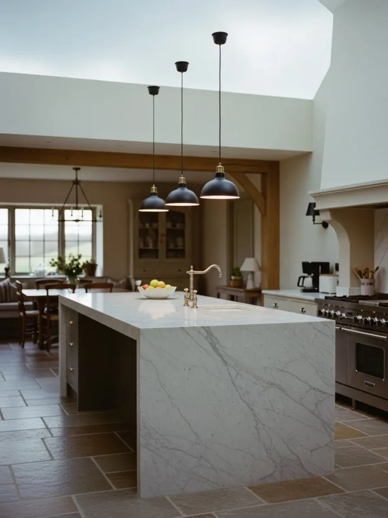 This kitchen plays with that perfect mix of luxury and farmhouse comfort in a way that just feels effortless. The oversized marble waterfall island takes center stage with its soft veining and clean edges that instantly make the whole space feel elevated. Warm stone flooring adds a grounded rustic touch that keeps things cozy instead of cold. The trio of matte black pendant lights brings in a charming industrial note while the skylight above floods everything with the dreamiest natural glow. With a professional style range and simple cabinetry in warm neutrals this space balances polish and practicality so beautifully.
