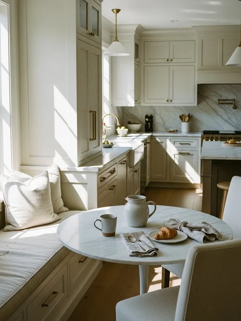 This kitchen feels like the sweetest blend of soft luxury and farmhouse charm. Warm sunlight pours across creamy cabinetry and marble countertops, giving every surface a gentle glow. The built-in window seat adds a cozy touch and makes the whole space feel loved and lived-in. Brass hardware and lighting bring in a quiet hint of sophistication while the round marble table and simple ceramics keep everything relaxed and welcoming. It is the kind of kitchen where mornings naturally slow down and where the first cup of coffee somehow tastes better.