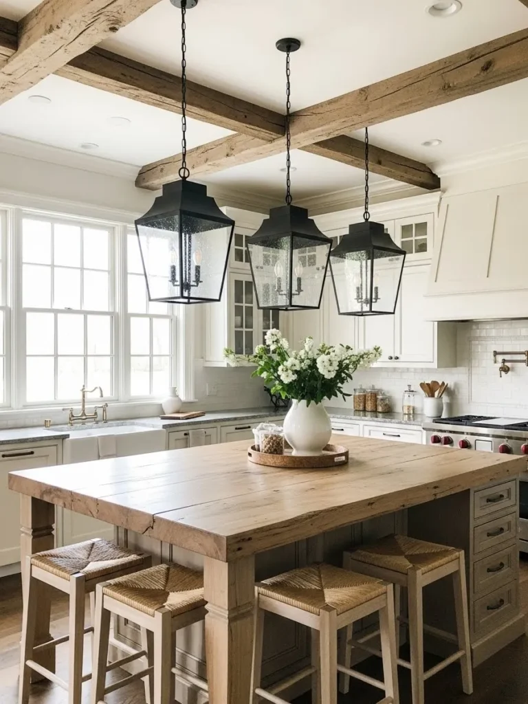 This kitchen blends classic farmhouse warmth with a subtle touch of luxury that feels so soothing. The natural wood beams add gorgeous texture overhead while the oversized lantern lights bring in a bold yet elegant focal point. The creamy cabinetry keeps everything light and airy and the chunky wood island feels sturdy and inviting at the same time. I love how the woven stools and simple white backsplash round everything out in a way that feels relaxed and refined. It is the kind of space that looks stunning without ever trying too hard.
