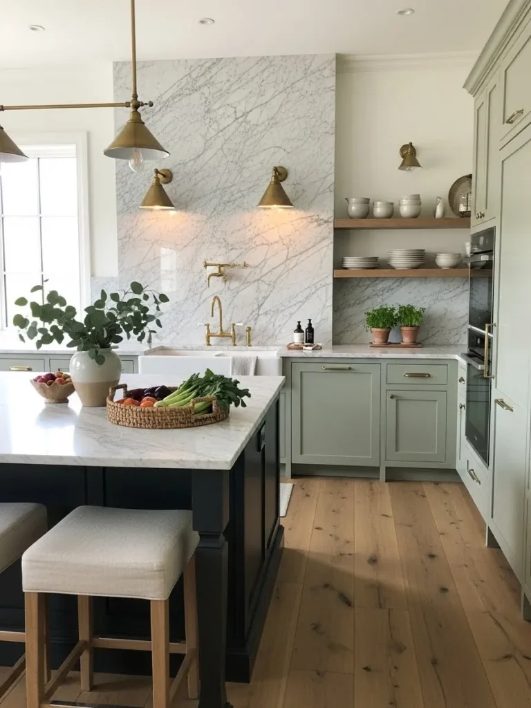 This kitchen blends soft sage cabinetry with stunning marble accents that make the whole space feel refined yet welcoming. The full slab marble backsplash creates a showstopping moment behind the brass pot filler and faucets while the warm wood flooring ties everything together with a cozy farmhouse touch. The island brings in a deep contrasting hue that adds richness without overpowering the room. Open wood shelves filled with simple ceramics introduce an easy relaxed charm and the brass sconces and pendant lights give the entire space a warm golden glow.