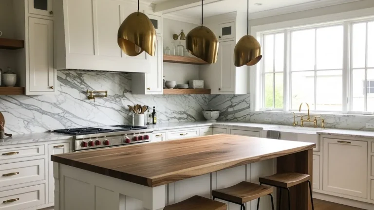 I love how this design strikes that perfect balance between refined and relaxed. The mix of warm wood and clean white feels calm and timeless and those lantern lights make me want to host a brunch just to show them off. It is the kind of kitchen that feels lived in but still special and I honestly would never get tired of walking into a space like this every morning.