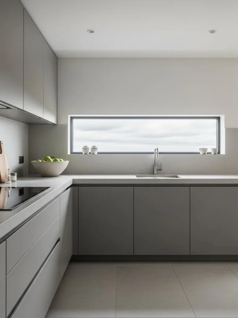 This modern kitchen feels so calming with its smooth grey cabinets and clean lines. The flat panel doors keep everything looking tidy while the soft matte finish adds a touch of luxury without trying too hard. The long horizontal window lets in the prettiest natural light and makes the whole space feel open even though the layout is compact. I love how the countertops stay clutter free except for a simple bowl of apples and a few ceramic pieces which gives the room a quiet elegance. The whole look is streamlined and fresh in a way that feels effortlessly chic.