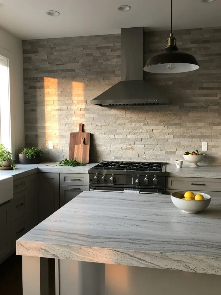 Textured Stone Backsplash With Warm Modern Charm