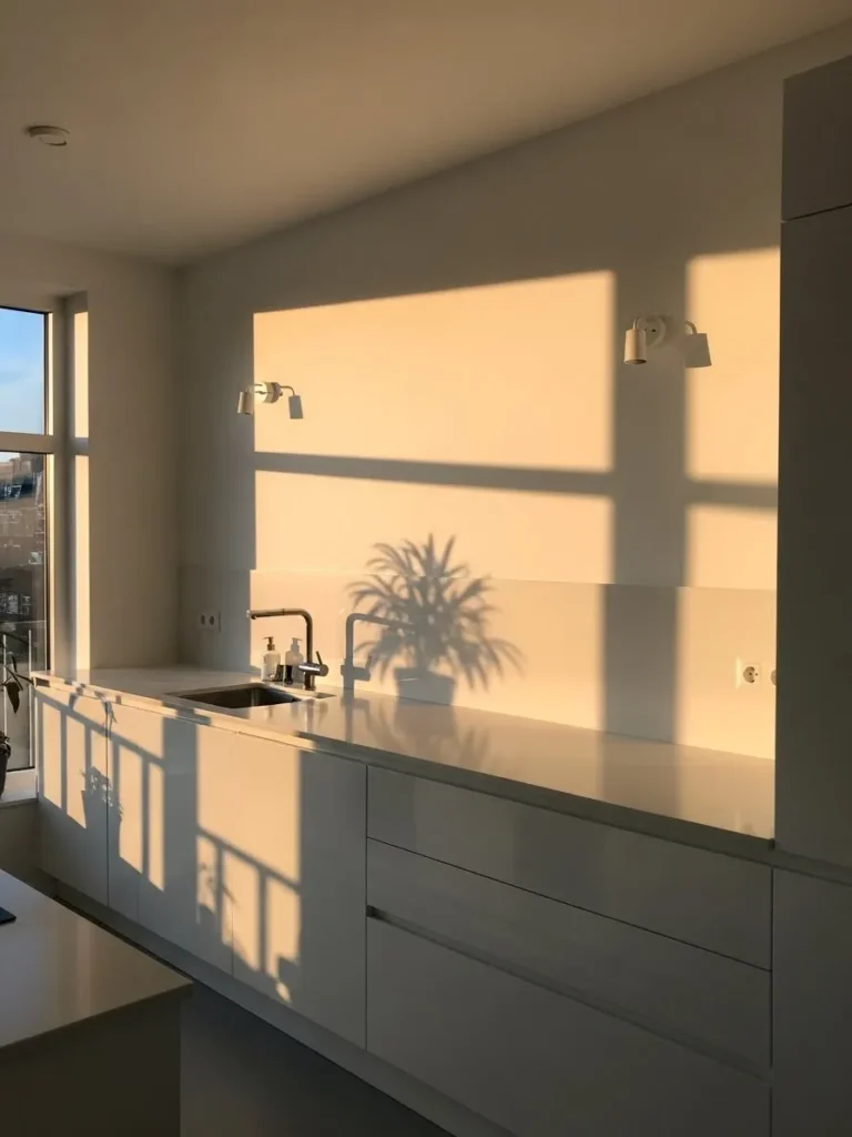 I love how peaceful this design feels. The golden hour glow makes the whole room look like it is wrapped in warm honey and it instantly softens the modern edges. It is such a lovely reminder that sometimes the simplest spaces end up feeling the most luxurious. I could happily make my morning coffee here and just enjoy the sunlight dancing across the counters.