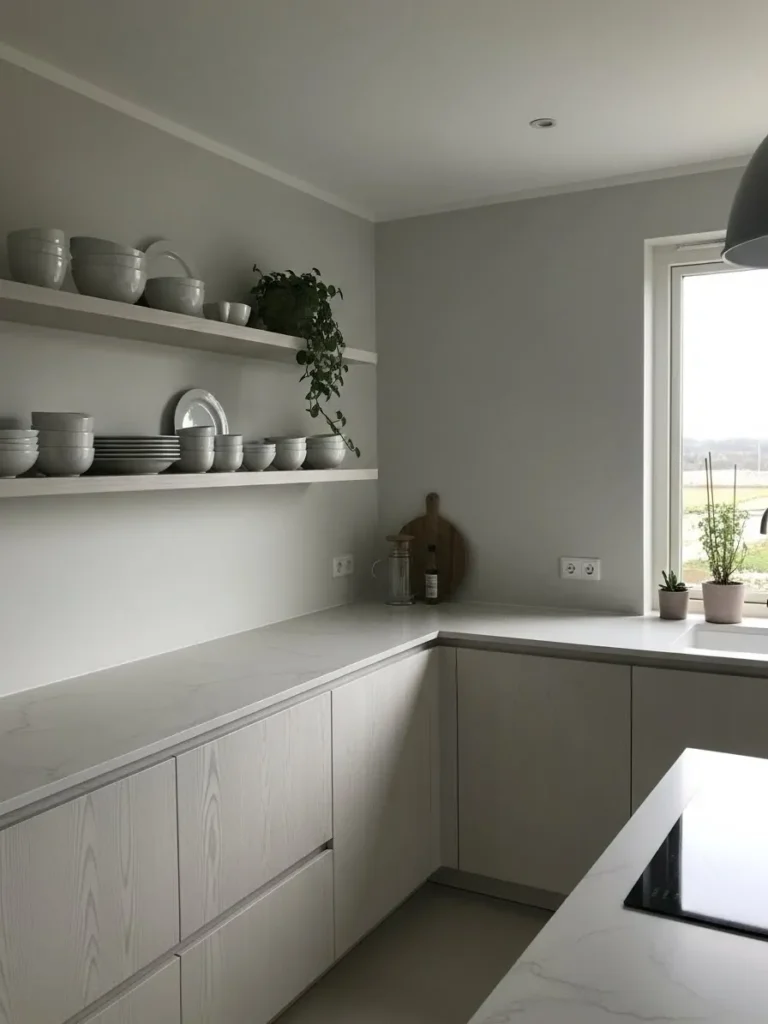 This kitchen leans into a beautifully calm Scandinavian look with its pale wood cabinetry, soft gray walls, and clean marble style countertops. The open shelves keep the room feeling airy while offering the perfect spot to display simple white dishes and a touch of greenery. Natural light pours in through the window and highlights the smooth surfaces and subtle textures that make the space feel both modern and warm. With no upper cabinets crowding the walls, the whole room feels wider and more soothing, almost like a quiet breath of fresh air.