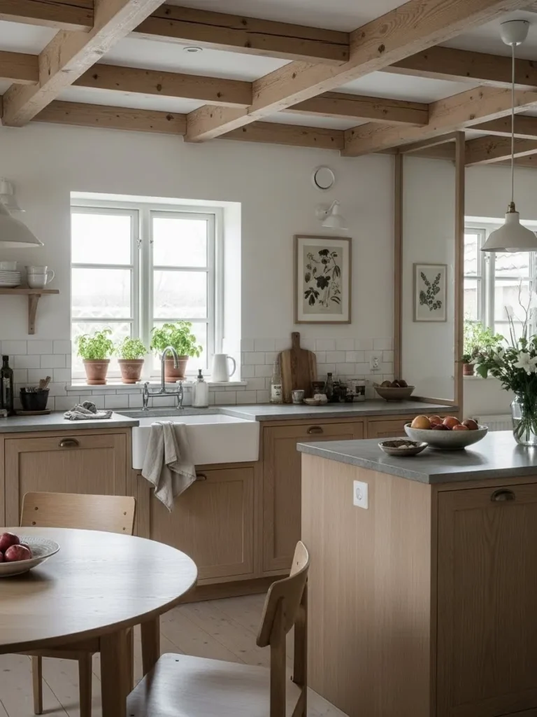 This cozy Scandinavian inspired kitchen feels instantly calm thanks to its gentle palette of warm wood, creamy walls, and soft natural light. The absence of upper cabinets lets the eye rest on the charming details that are usually hidden away. The exposed ceiling beams add so much character without overwhelming the space, and the farmhouse sink feels perfectly at home beneath the double window framed by fresh herbs. Light oak cabinetry and simple open shelving keep everything airy while still offering plenty of storage. The whole room feels intentionally understated in the loveliest way.