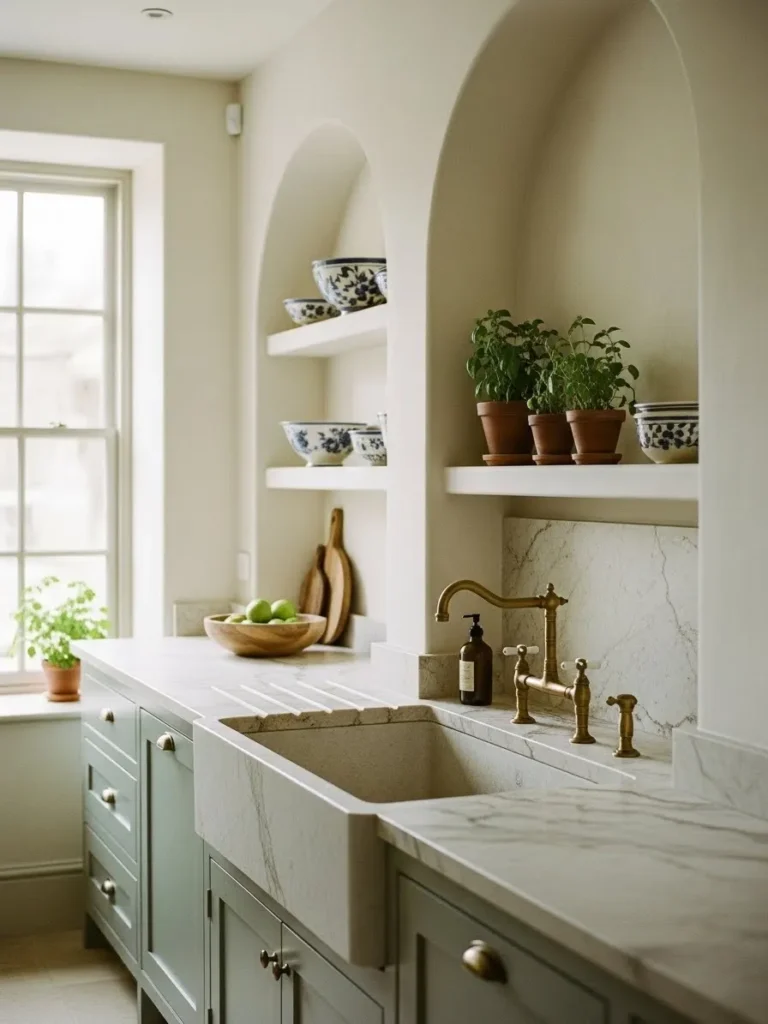 This kitchen feels instantly calming with its pretty arched wall niches that take the place of traditional upper cabinets. The open shelves make the whole room feel light and airy while showing off those gorgeous blue floral bowls and sweet little herb pots. Soft green cabinetry pairs beautifully with the warm brass faucet and the creamy marble countertops. Everything feels thoughtfully placed and wonderfully simple in the best way.