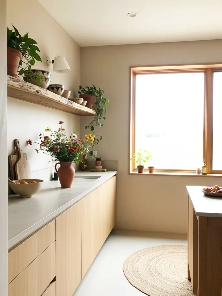 This kitchen feels like the perfect balance of simplicity and soul. Light wood cabinetry keeps the space soft and airy while the absence of upper cabinets opens everything up in the most refreshing way. A single rustic shelf holds a sweet collection of pottery and trailing plants that add gentle movement to the clean lines below. The large window pulls in so much natural light that the whole room seems to glow. A round woven rug and a vase of wildflowers bring in a soft cottage charm that pairs beautifully with the minimalist layout.