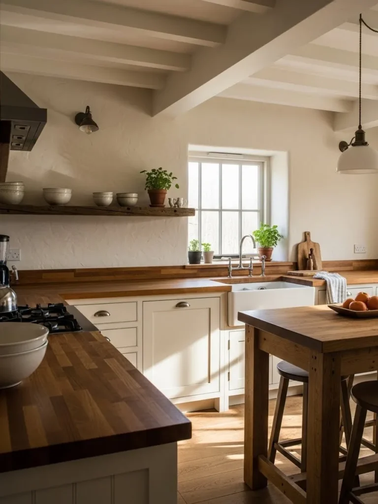 This kitchen embraces a sweet cottage charm with its soft cream cabinetry, chunky wood countertops, and the prettiest natural light pouring in from a simple grid window. The open wall space feels intentional and calm, especially with that single rustic shelf holding just a few bowls and little potted herbs. Everything feels earthy and unfussy. The farmhouse sink adds a classic touch and the mix of warm wood tones gives the whole room a cozy glow. It is the kind of space that feels collected over time instead of perfectly staged which makes it even more inviting.