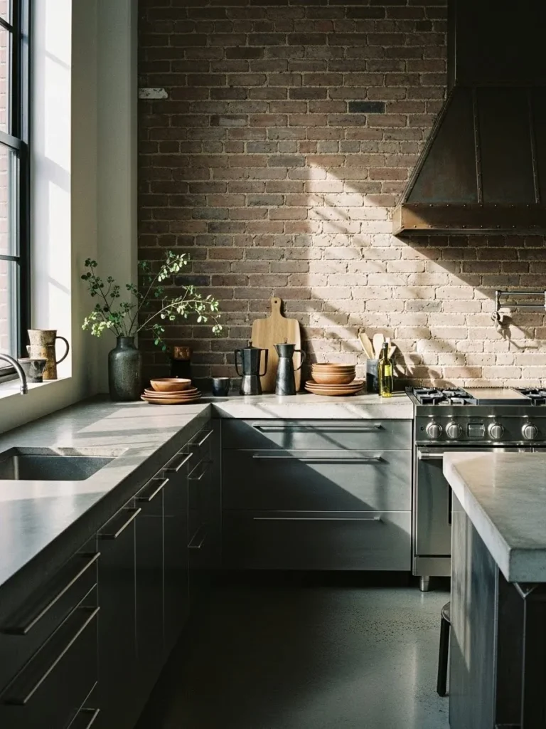 This kitchen brings together all the things I love about an urban loft space. The exposed brick wall instantly sets the mood with its warm texture while the sleek lower cabinets keep everything feeling modern and polished. The absence of upper cabinets lets the natural light flood in from that gorgeous window which makes the whole space feel open and calm. I also adore the mix of materials from the matte concrete countertops to the industrial metal range hood because it gives the room this effortless balance between rugged and refined.