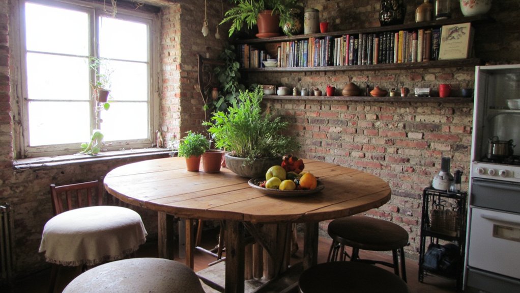 I love mixing distressed wood with retro bar stools and antique lighting fixtures. These elements create a cozy, inviting atmosphere.