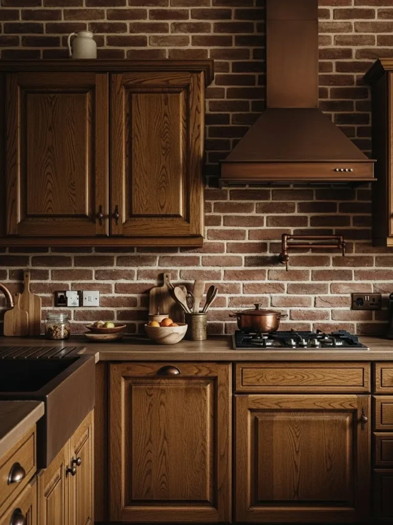 This rustic kitchen leans into warm natural textures with its beautiful wood cabinetry and classic brick backsplash. The deep honey tone of the cabinets adds a grounded and welcoming feel, and the raised panel doors give the space a timeless presence. The brick wall brings in that cozy cottage charm while the copper range hood and pot filler add a touch of old world character. Everything feels intentionally layered to create a kitchen that is both sturdy and inviting, the kind of place where meals simmer slowly and mornings feel calm.