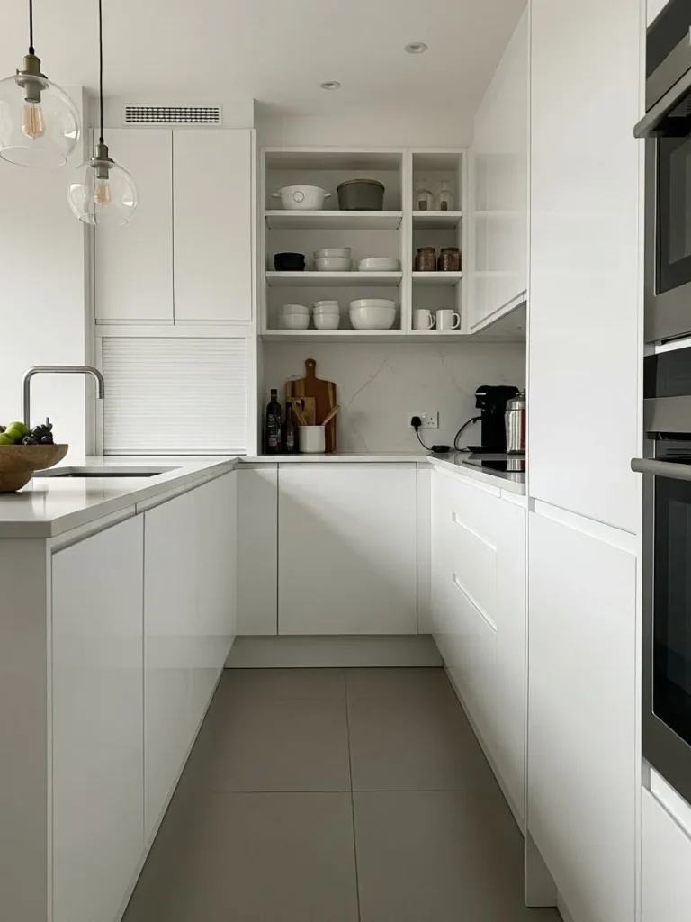 This small kitchen shows how clean lines and thoughtful storage can make a compact space feel surprisingly open. The all white cabinets create a seamless look that keeps the room feeling calm and uncluttered. I love how the upper open shelves add personality while keeping essentials within reach. The built in appliances and the clever roll front cabinet help everything stay tidy which is such a win in a smaller layout. Soft lighting and simple decor tie the look together in a way that feels both modern and welcoming.