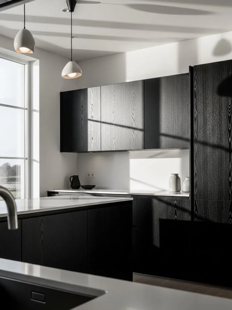 This kitchen brings a gorgeous blend of bold black wood cabinets and calming modern lines. The grain of the wood shows through beautifully which keeps the deep color from feeling heavy. Soft natural light pours in from the large window and highlights those subtle textures in the prettiest way. Clean white countertops brighten the space and give everything a fresh balanced look. Simple pendant lights add a hint of charm without taking attention away from the stunning cabinetry.