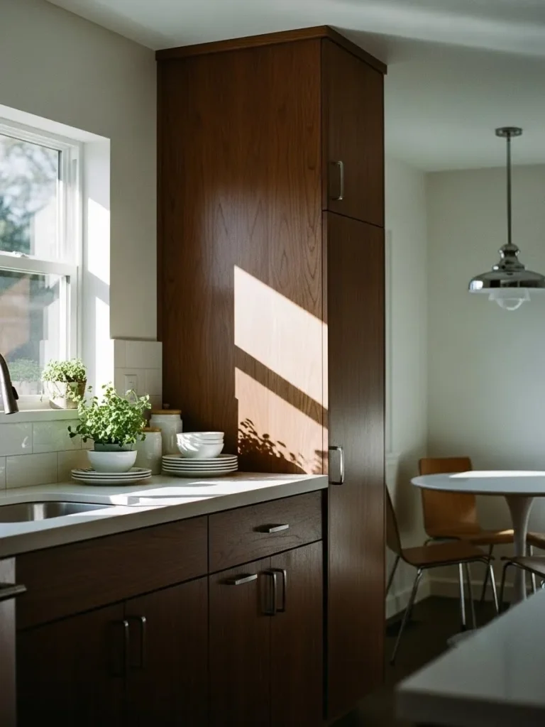 This kitchen pairs rich walnut cabinets with a fresh white countertop for a look that feels both warm and modern. The tall pantry cabinet adds a beautiful vertical moment that draws the eye up, and the sunlight catching the wood grain gives the whole space a soft natural glow. The simple brushed metal hardware keeps everything feeling streamlined while the greenery by the window adds a little life and color without overwhelming the calm palette. It is the kind of design that feels effortless yet very intentional at the same time.