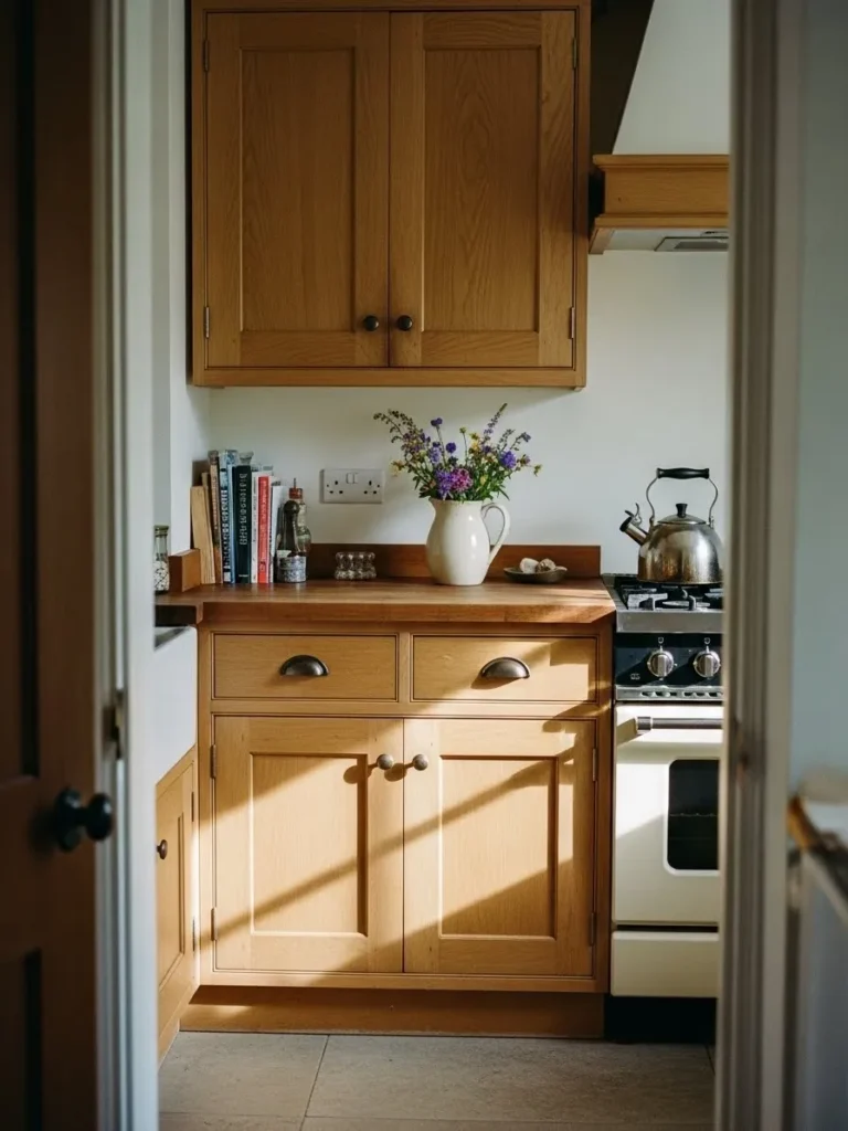 This sweet little kitchen nook feels like a warm hug thanks to its classic cottage style wood cabinets. The natural oak tone brings a soft and sunny look to the space, especially with the way the light lands on the shaker doors. The simple round knobs and cup pulls keep everything charming and unfussy while the butcher block countertop adds even more natural texture. I love how the open counter space holds a few cookbooks and a pretty pitcher of wildflowers which makes the whole corner feel lived in and loved.